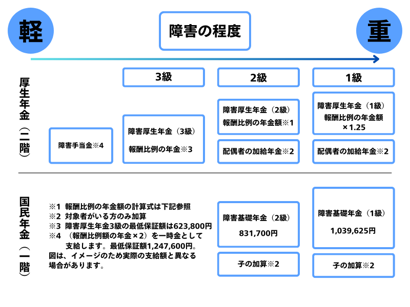 障害の状態により、障害基礎年金は1級・2級、障害厚生年金は1級~3級の年金を受け取ることができます。また、障害厚生年金1級・2級に該当する場合は、障害基礎年金もあわせて受け取ることができます。なお障害年金の1級の額は、2級の1.25倍となります。